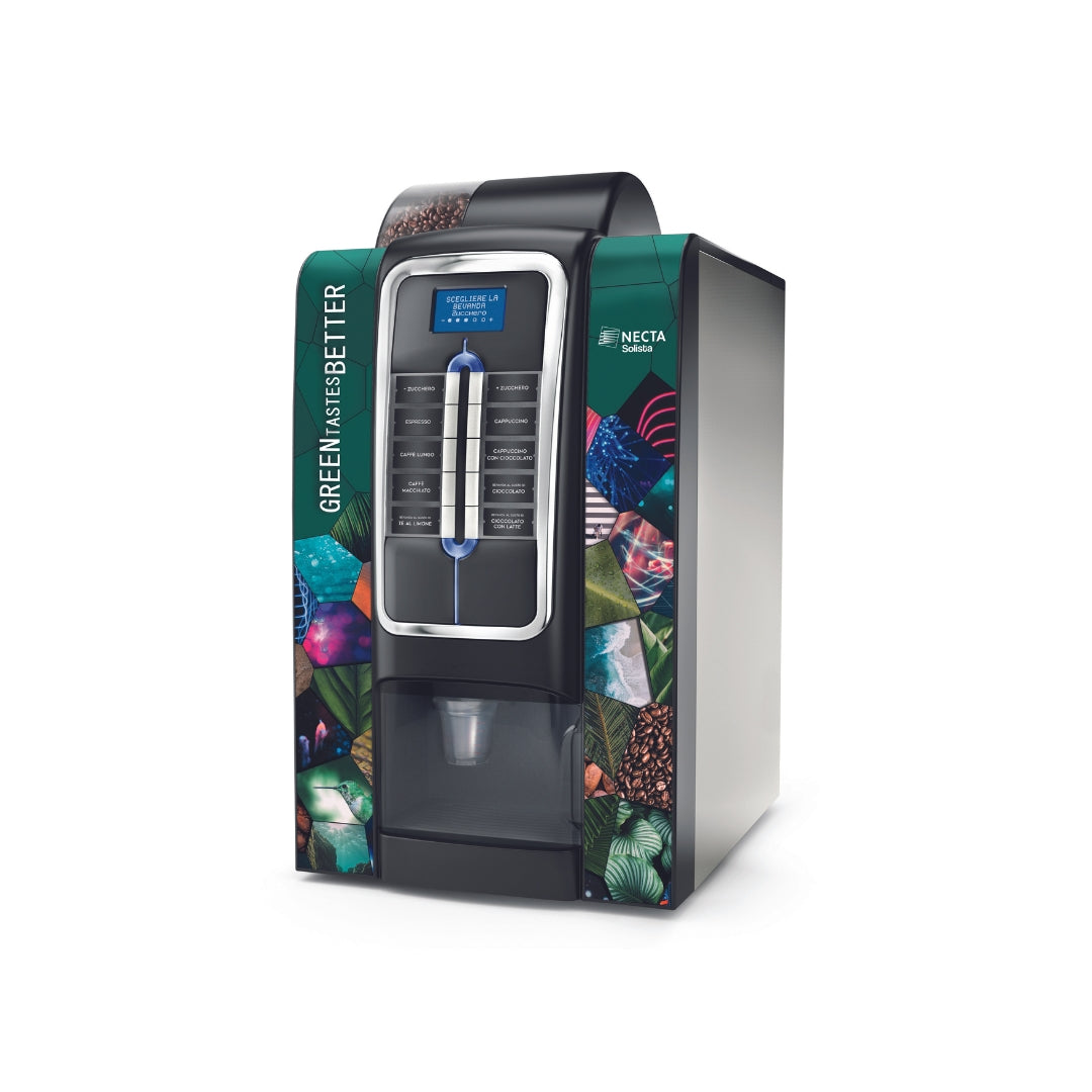 Elegancia y Rendimiento en Table Top. La Solista de Necta es un modelo table top que redefine el estándar en máquinas de bebidas para espacios pequeños. Con un diseño elegante, iluminación LED y un marco cromado que rodea el área de selección, esta máquina se destaca por su estilo moderno y sofisticado.